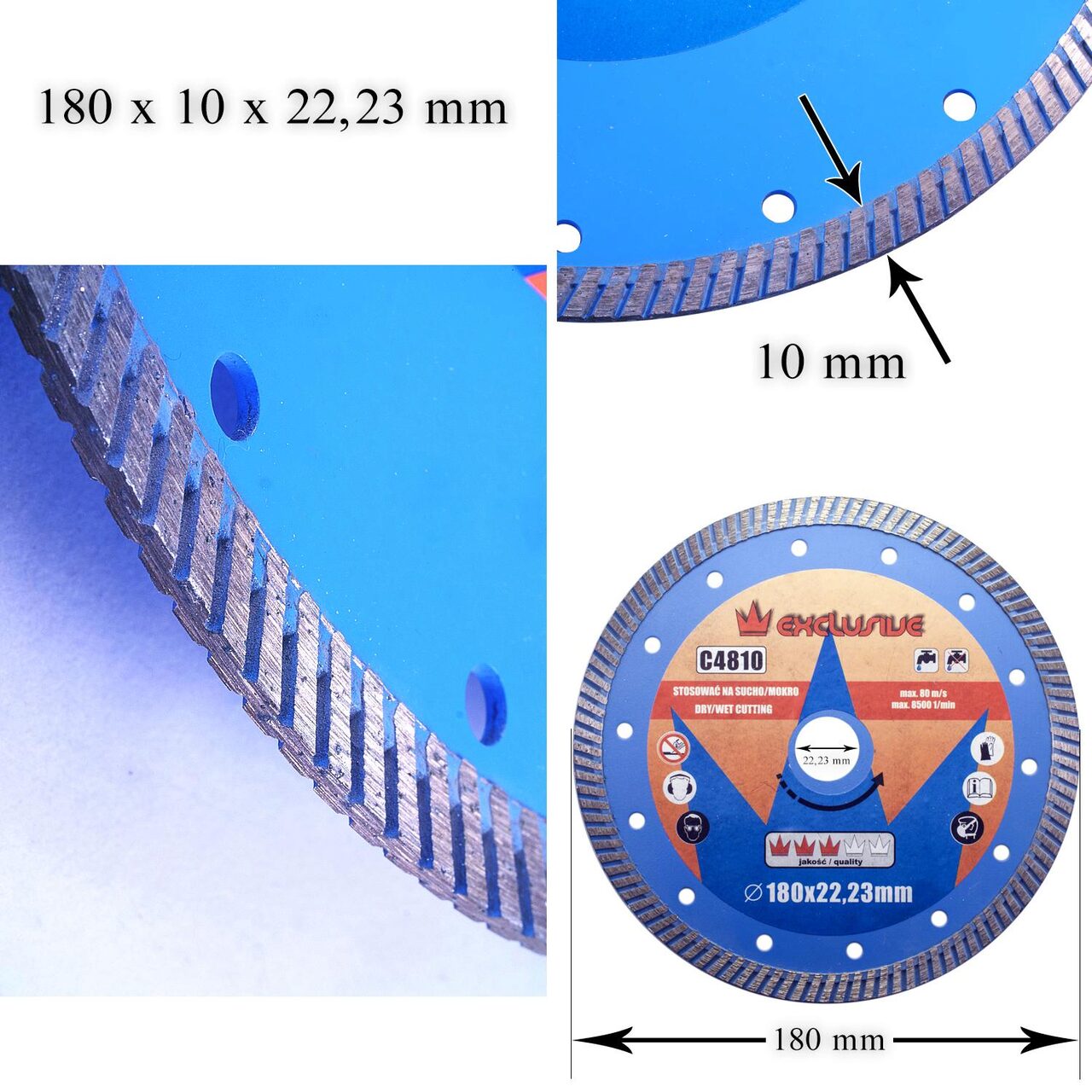 Diametrul discului este de 180 mm, grosimea este de 3,0 mm, alezajul este de 22,23 mm si suprafata diamantata este de 10 mm.