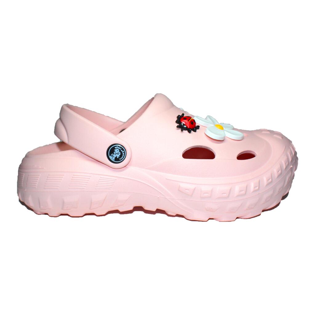 - Un accent estetic deosebit al acestui model il reprezinta setul de jibbitz-uri in forma de floricele de diferite marimi si o mica buburuza, care adauga un farmec aparte incaltamintei.