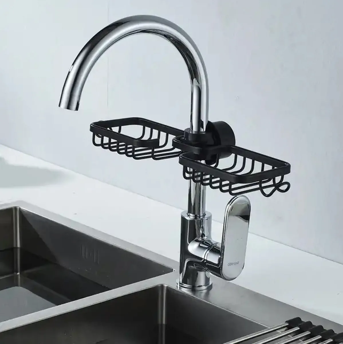 Un organizator universal de bucătărie conceput pentru a fi atârnat direct pe robinet. Umeraș suplimentar pentru un prosop sau o cârpă (înșurubat din față).