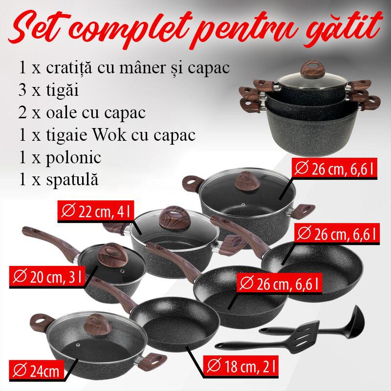 - Datorita materialelor de inalta calitate, a suprafetei antiaderente din marmura si a designului elegant, setul ofera solutia perfecta pentru gatitul si servirea zilnica.